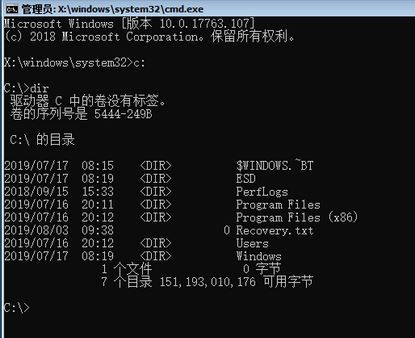 执行命令C:回车切换到C盘,再执行命令dir回车查看文件列表,检查是否包含Windows文件夹以确认当前盘符就是系统所在的C盘: