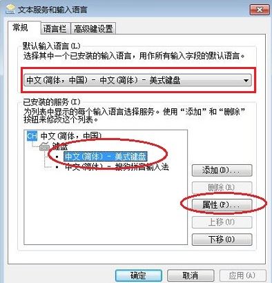 2、在弹出的“文本服务和输入语言窗体里面”,点击“中文(简体)---美式键盘”,这时,右边的属性按钮就可以点击了。点击那个属性按钮;