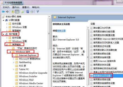 步骤二:用户配置---管理模块---Windows组件---Internet Explorer,然后打开右侧窗格中的“禁用更改主页设置”项;
