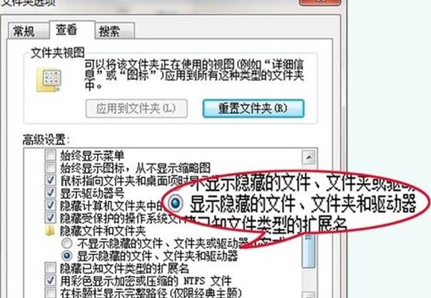 1、打开资源管理器,或者任意文件夹,在“组织-文件夹和搜索选项”进行设置,在“文件夹选项”对话框中选择“查看”选项卡,设置“显示隐藏文件、文件夹和驱动器”。