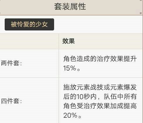 2.第二选择:女孩四件套加一件圣物。少女套装的效果是释放元素爆发后,10秒内团队所有角色的治疗量增加20%,可以进一步增加贝内特的奶量。