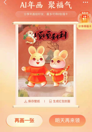 1.选择“AI年画”,点击“画年画获得祝福卡”,根据提示画一只兔子,然后自己设计生成年画。