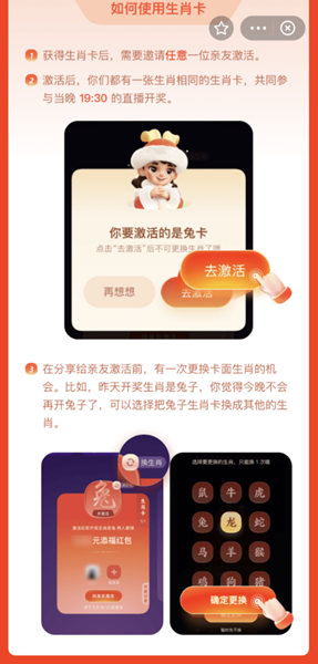 3.生肖卡的使用方法:拿到生肖卡后,需要邀请好友激活。激活后两个人会有一张生肖卡,每晚19:30开奖。如果你选择的生肖是中奖的生肖,你可以和五福一起获得红包。