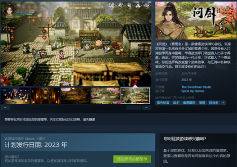 国产像素武侠RPG游戏《代号:问剑》将于2023年发售。