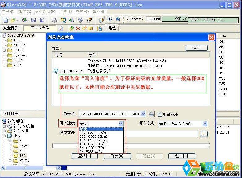 4、检查并选择正确的刻录机设备,选择光盘写入速度(CD刻录机推荐 40X左右 DVD推荐12X-16X,一般不满速即可),然后点击刻录。