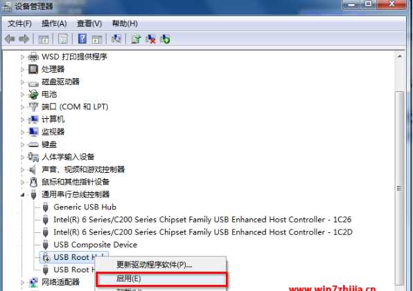 3)这边会看到“USB Root Hub”在禁用状态,鼠标右击“USB Root Hub”选择“启用”即可;
