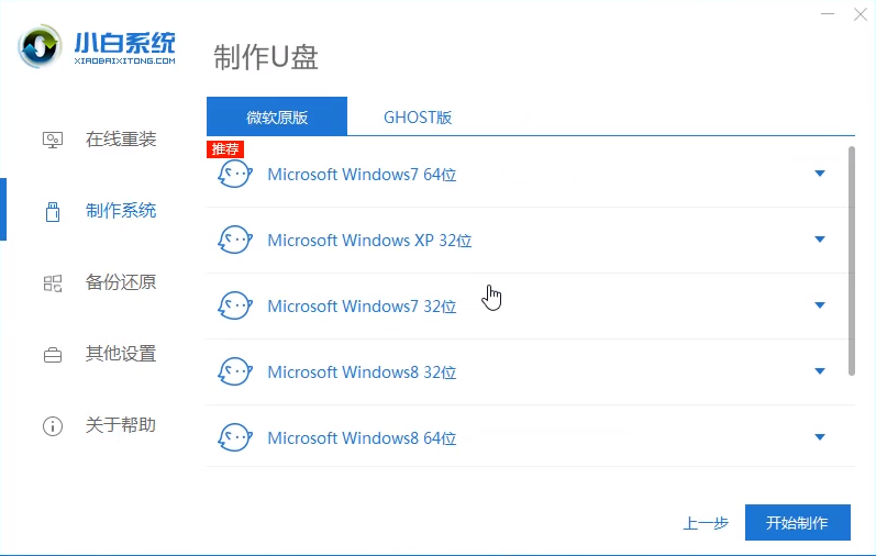 2、打开制作系统选项(制作启动盘),选择U盘,点击开始按默认参数制作。
