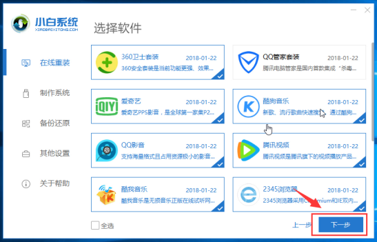 2. 选择需要安装或不需要安装的软件。重新安装完成后,会自动安装选择的软件,点击下一步。