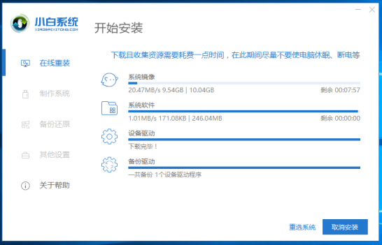 3.等待系统镜像、软件、驱动程序等下载完成,然后电脑会自动重启进行安装。以下步骤不需要您自己手动操作。等待安装完成并进入系统。