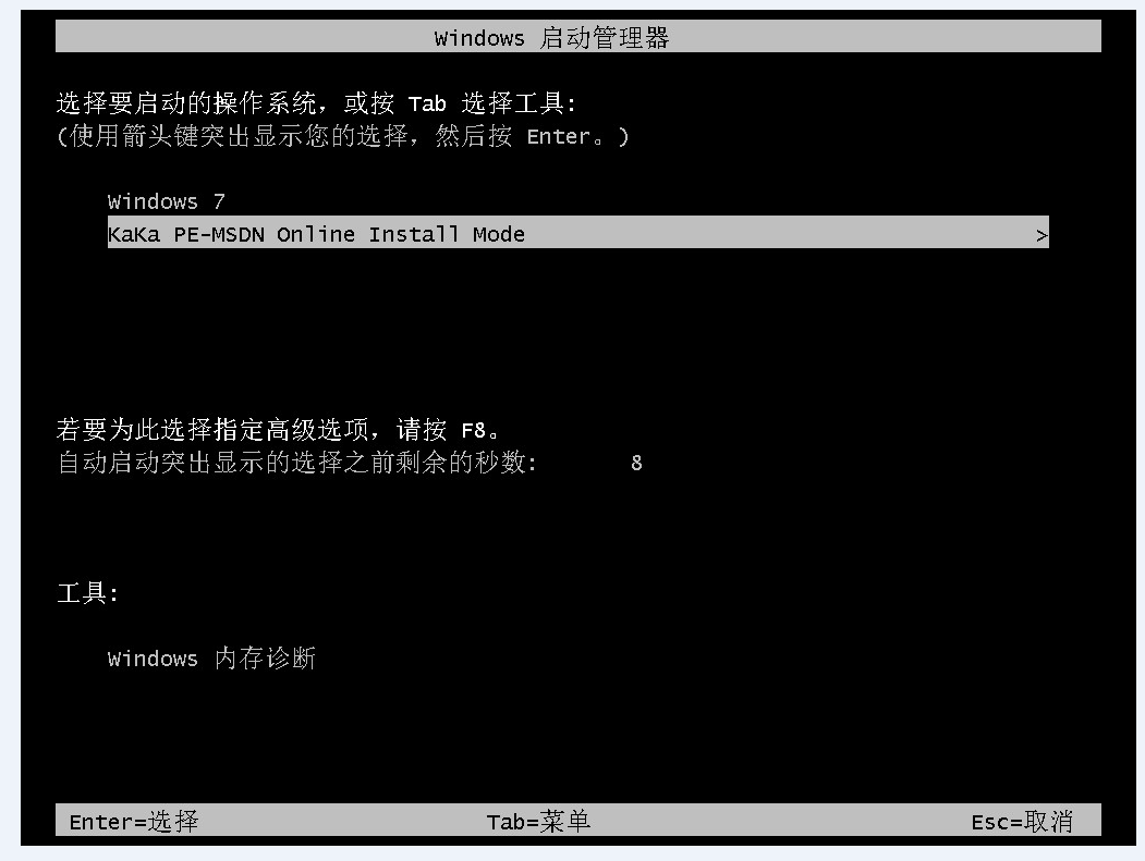 6、进入启动管理器页面,选择第二项“KaKa.”,回车进入pe系统。