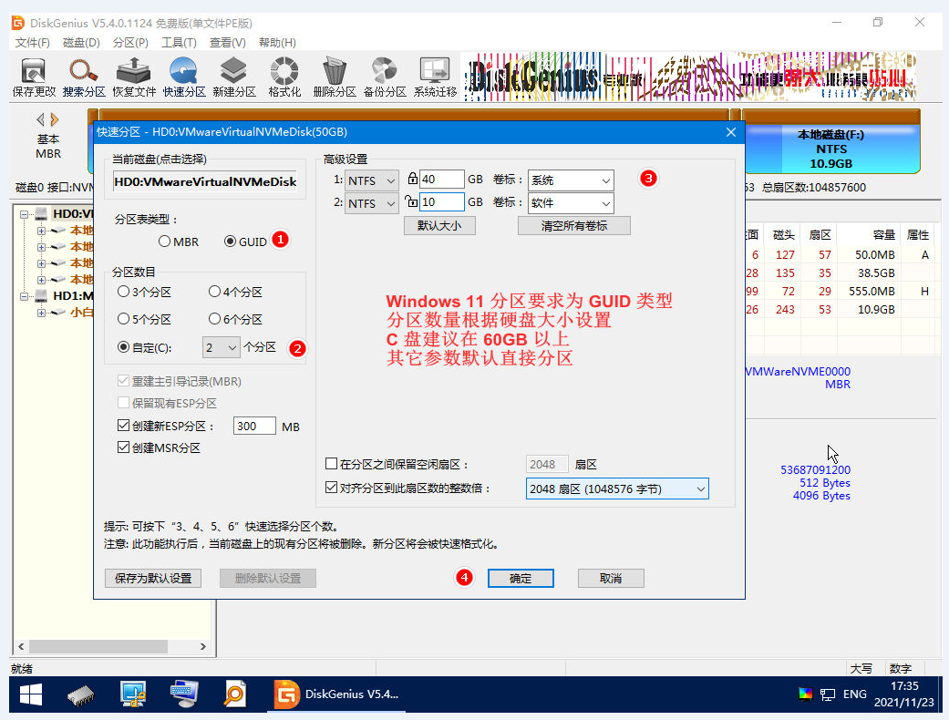 注意:Windows 11 要求分区类型为GUID 类型。分区的数量可以根据硬盘的大小来选择。一般500GB可以分为四三个区域,其他的可以自己确定。