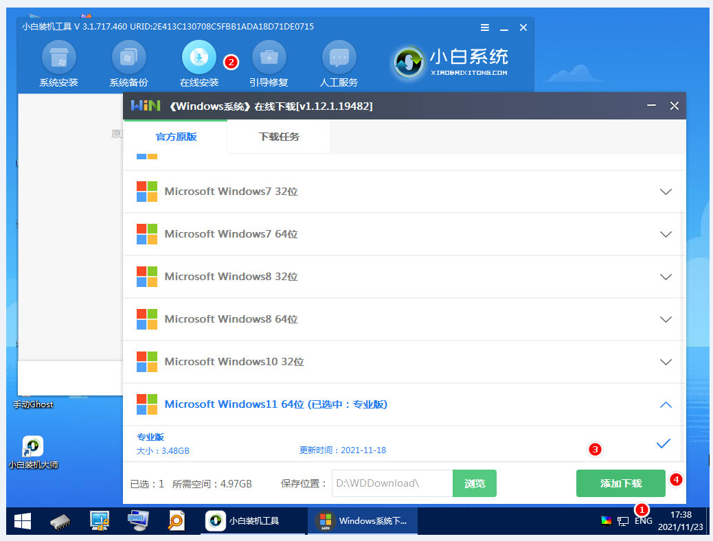 5、分区完成后,打开桌面上的小白安装工具,选择在线安装,根据自己的需要选择windows镜像文件,选择后点击添加下载。