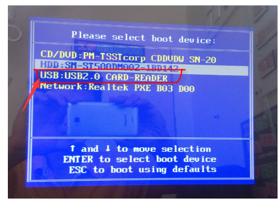 6、重启时按启动快捷键进入启动界面,然后选择U盘进入。