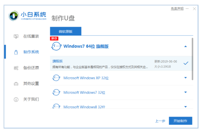 1、安装后打开小白一键重装系统工具,插入U盘,选择U盘重装系统模式,点击开始制作。