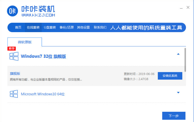 2、打开卡卡安装软件后,选择在线重装一栏,点击需要安装的win7系统进行安装。