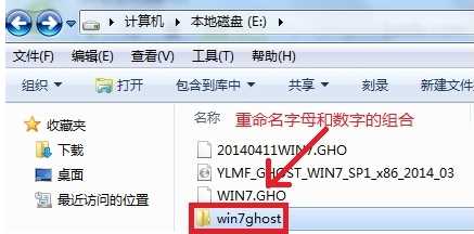 方法一:重命名镜像包文件名-》重命名整个win的ghost镜像包文件名,文件名一律用字母或数字或字母和数字的组合,如win7ghost,如下图