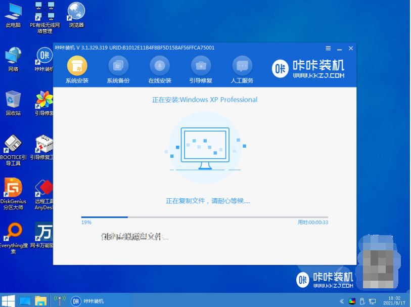 4、卡卡安装工具自动安装XP系统,安装完成后重启电脑。