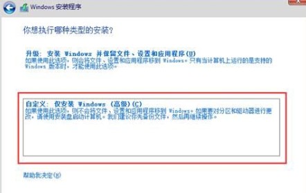 7、接着会让我们选择希望执行哪种类型的安装,一般选择“自定义”;