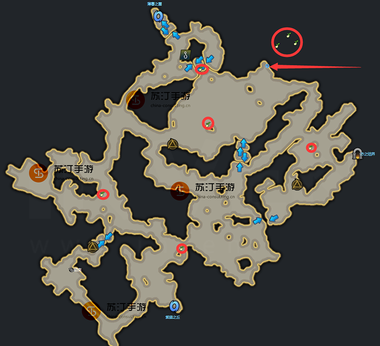 命运方舟之音森林:8 个莫可可种子。在地图的右侧,红色箭头会有对应的隐藏入口。您可以从隐藏通道中获得3 个Mokoko 种子。其他5 个Mokoko 种子对应位置。红圈位置就是Mokoko位置。具体位置。如图所示: