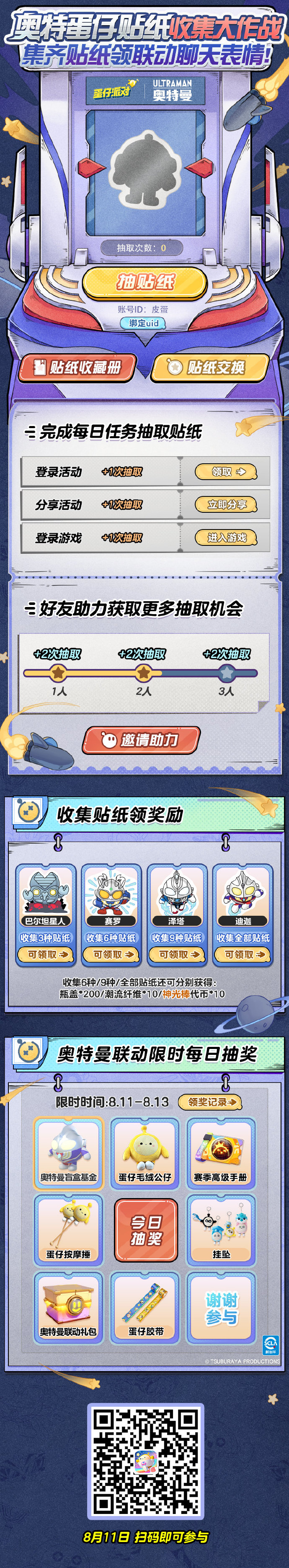 8月11日-8月24日,【超蛋蛋贴纸收集大作战】小程序活动开启。收集链接的角色贴纸即可兑换链接的表情包和其他丰厚礼物! 8月11日至8月13日,蛋蛋们还可以在小程序中参加奥特曼每日抽奖,获得联动礼包、盲盒资金、实物奖励!