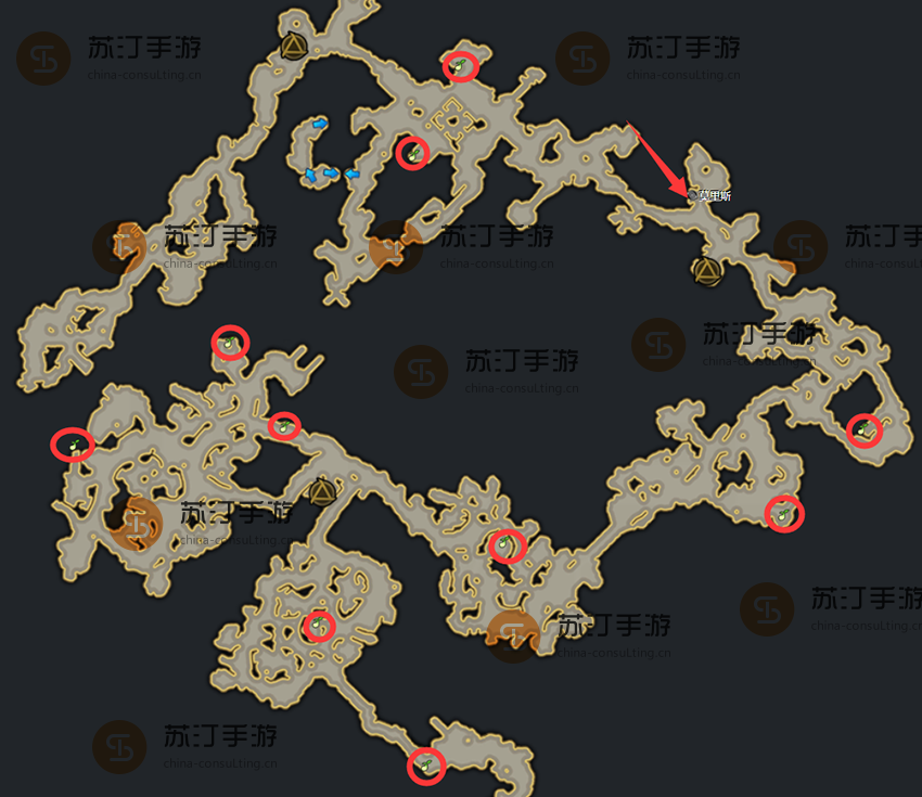 1、地图上红色箭头所在的位置就是流浪商人的位置。其他分散的莫科科斯的位置已经在地图上完整标明了。详细位置如下图所示: