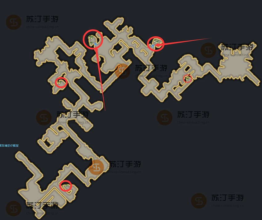 这个圣疗堂地下副本的地图就在黑玫瑰圣疗堂地图的右侧。地下城地图也会有玩家需要的莫可可种子。地牢中一共有8颗莫可可种子散落,玩家需要再打开2颗。有一个隐藏的入口。具体位置在地图上标注的很清楚。让我们来看看。
