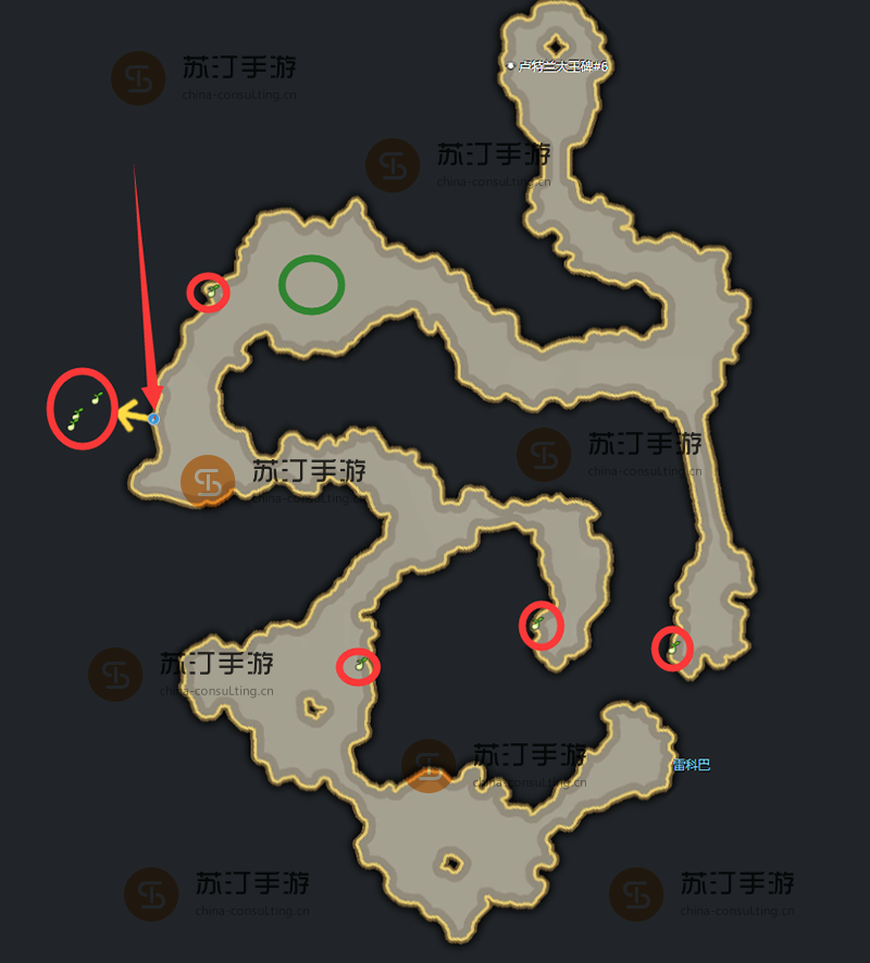 2.红色箭头的位置就是隐藏入口。打开隐藏入口的条件是“清除绿色圆圈内的boss利克图斯,返回隐藏入口,直接向九点钟方向走”。可以直接进入隐藏空间。共有3 个mococo 种子。其他mococo种子的具体位置如下图所示: