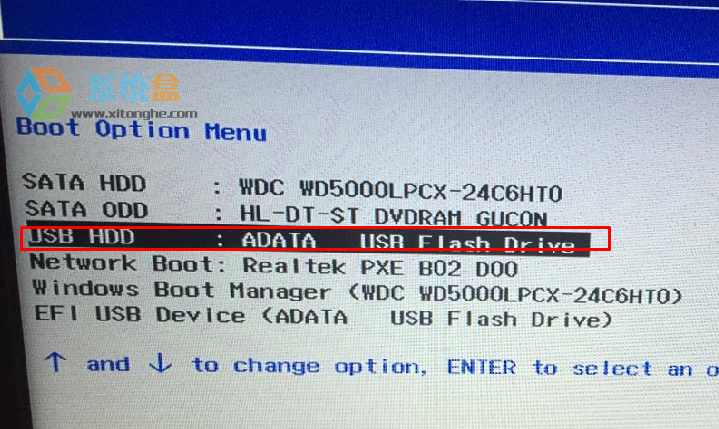 7、重启后,我们按下FN+F12键,xitonghe.com就可以启动设备选项界面了~选择你的U盘启动盘(USB HDD开头的),回车即可;