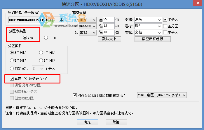 12、转换完成后,执行快速分区,分区大小几磁盘个数自己选择,确保分区表类型为MbR ,及勾选了重建主引导记录MBR,按下确定后开始分区;
