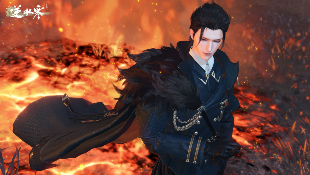 【绽放之火】男装身穿深蓝色军装,胸前的勋章与肩上的绶带相得益彰。女装则以深宝石蓝为底色,裙摆随着你的走动而显得更加星光熠熠,尽显你的威严与从容。