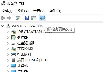 2、在设备管理器总顶部点击工具栏中的“扫描检测硬件改动”图标,看看各驱动中是否出现黄色的感叹号警示标志;