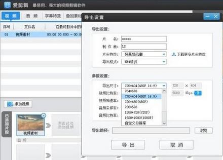 4、然后将鼠标光标移动到软件的右侧,点击 导出视频 选项,在参数设置的视频尺寸处选择合适的视频尺寸并且设置导出路径后,再点击 导出 就可以,如下图所示: