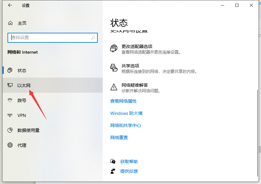 2. 在打开的网络和Internet 设置窗口中,单击左侧边栏中的“以太网”菜单项。