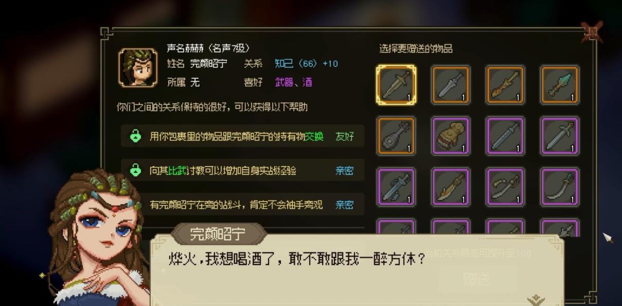 8、然后送礼物,增加完颜昭宁的好感度。将好感度提升到生死关头,就会开始喝酒剧情。