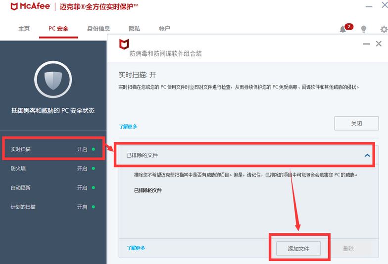 方法二:如果不想关闭迈克菲,选择实时防护选项,将软件安装目录所有文件填写到排除列表,打开迈克菲,在PC安全 界面 左侧点击【实时扫描】,在右侧展开【已排除的文件】,然后在下面点击【添加文件】,然后将疯狂的美工添加到信任,如图: