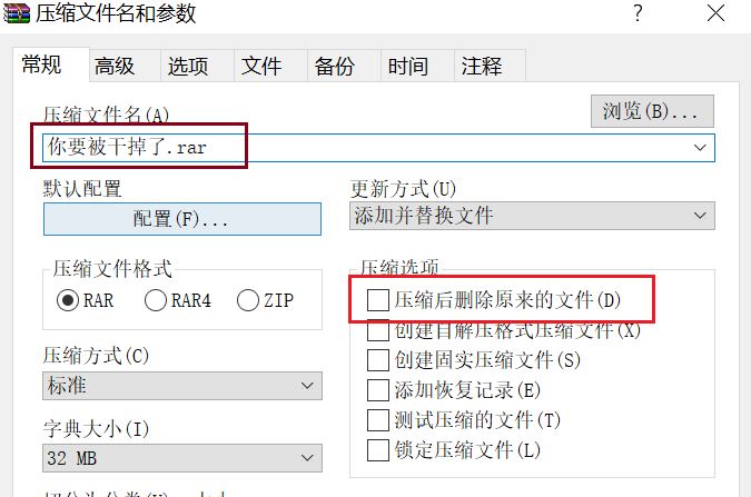 接着随便起个压缩文件的名字,并勾选“压缩后删除原来的文件”,同样可以直接干掉这些顽固的家伙们!