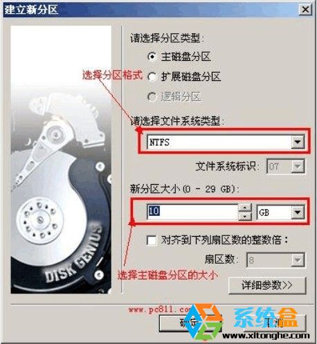 2、如上图所示,请选择主磁盘分区,系统文件格式可以选择NTFS和FAT32(推荐NTFS格式),设定好分区大小(也就是C盘大小,一般XP建议15-30G,win7建议30-60G左右)设置完成点击确定;
