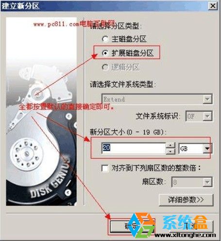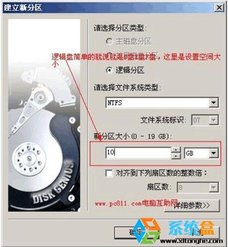 默认逻辑分区。还有文件类型等设置,需要注意的是新分区的大小,默认是整个扩展分区的大小,如果我们要在扩展分区的基础上再分两个区的话那么我们可以选择扩展分区的一部份如10G,多出来的10G再分成一个逻辑分区。同样的,我们设置好后点击确定就可以了;
