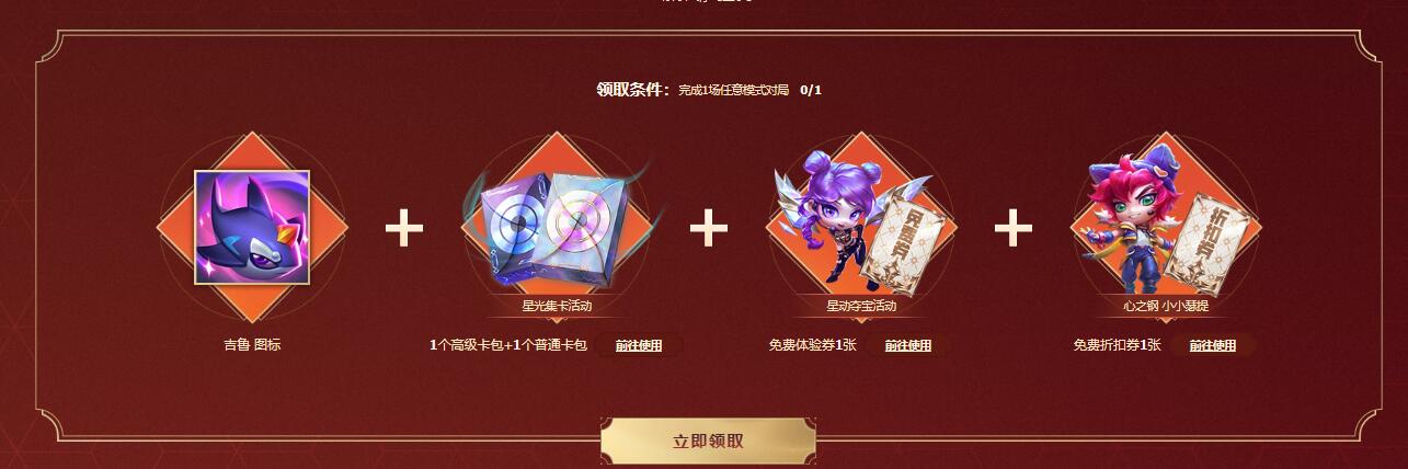 吉鲁图标、星光卡牌收集活动高级卡包1张+基础卡包1张、云顶星寻宝活动免费体验券1张、心钢小瑟提召唤活动50%折扣券1张。