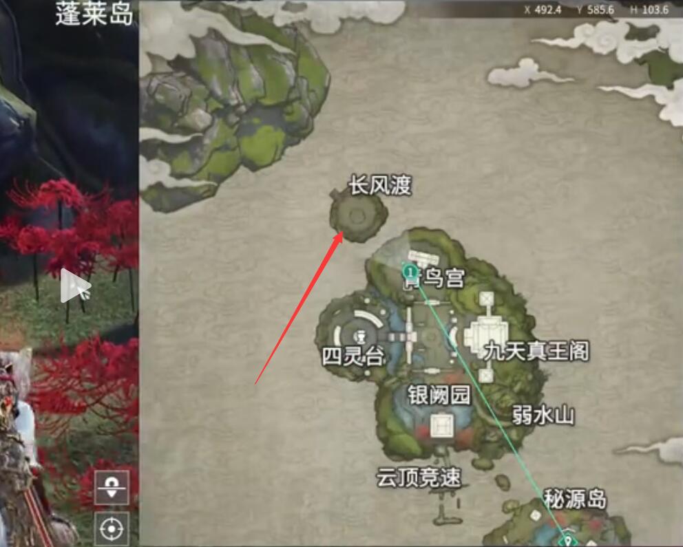 2、箭头所在的位置就是松树所在的位置,它的名字叫长风渡;
