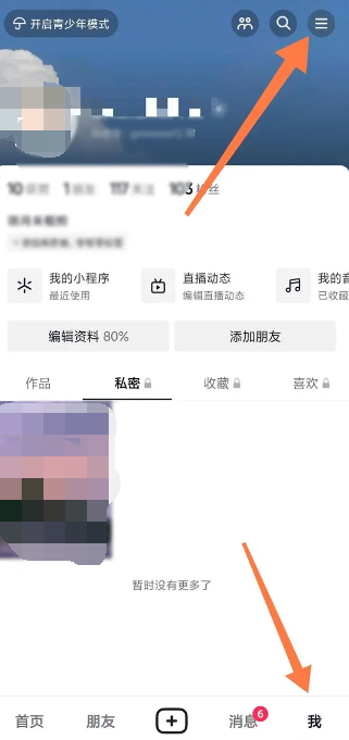1、首先我们打开抖音,点击右下角的我,然后点击个人界面右上角的三栏。