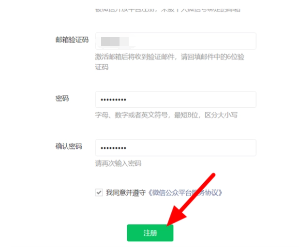 6.我们输入收到的邮件验证码,输入密码,勾选同意协议框,点击注册。