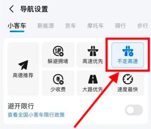 3、最后我们点击“选择不走高速公路”选项,完成高德导航不走高速公路的设置。