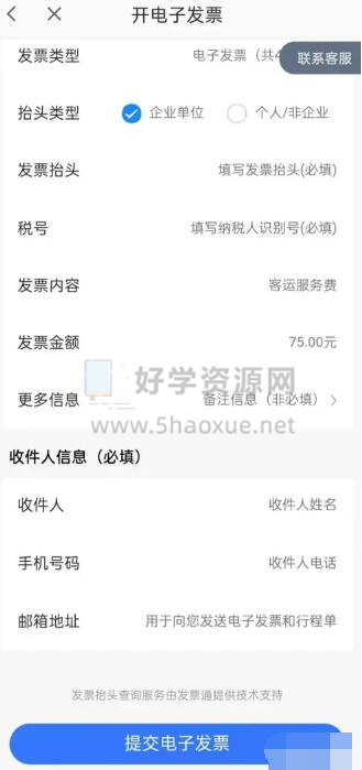 5、最后输入个人信息,点击提交电子发票即可在高德地图上开具出租车发票。