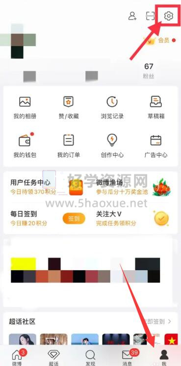 1.首先打开微博,点击右下角的我,然后点击右上角的设置。