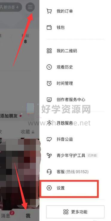 1、首先我们打开抖音,点击右下角的我,然后点击右上角的三个横排图标,点击设置。
