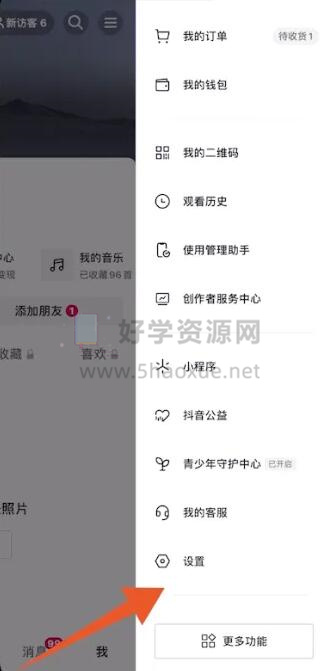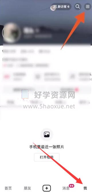 1、首先打开抖音,点击右下角的我,然后点击右上角的三个横排图标。