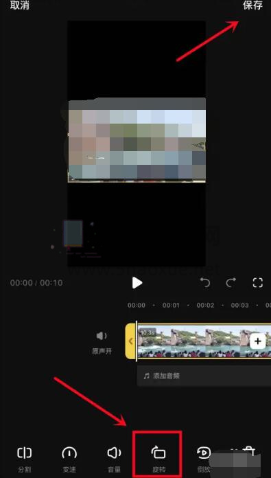 5、最后我们点击底部的旋转选项,然后点击右上角的保存,将抖音发布的作品设置为横屏全屏播放。