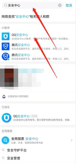 1、首先我们打开QQ,搜索安全中心,点击QQ安全中心小程序。