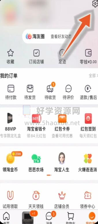 1、首先我们打开淘宝,点击右下角的我的淘宝,然后点击右上角的设置图标。
